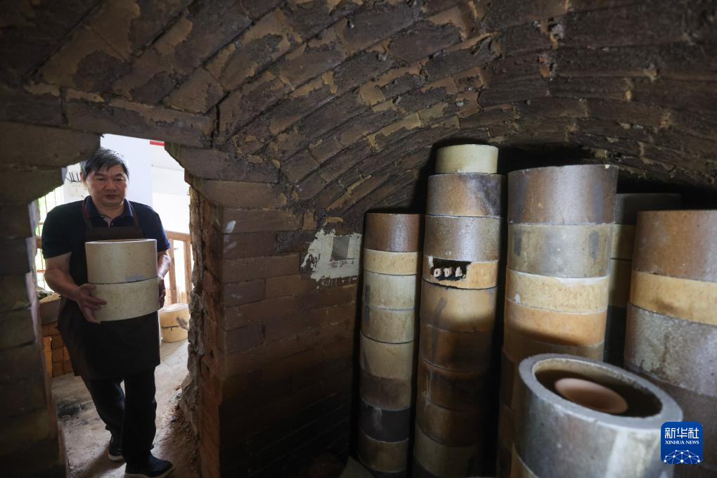 5月29日,中国陶瓷艺术大师、浙江省非物质文化遗产越窑青瓷传承人孙迈华在龙窑旁给瓷坯上釉。
