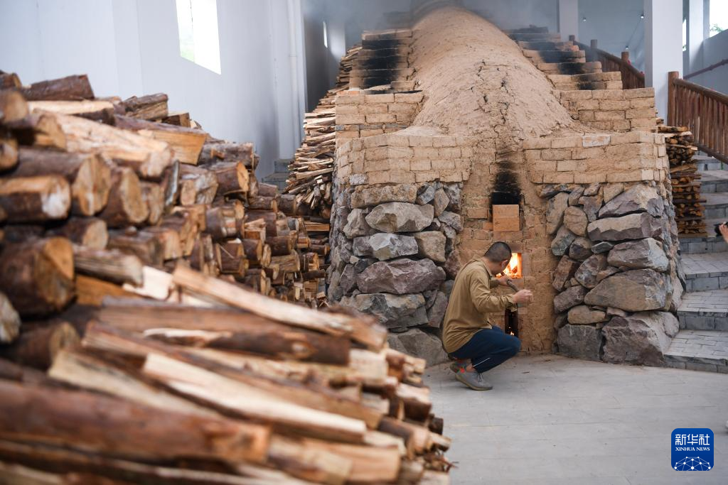 5月31日,在慈溪市上林湖青瓷传承园,工作人员为龙窑添柴烧火。