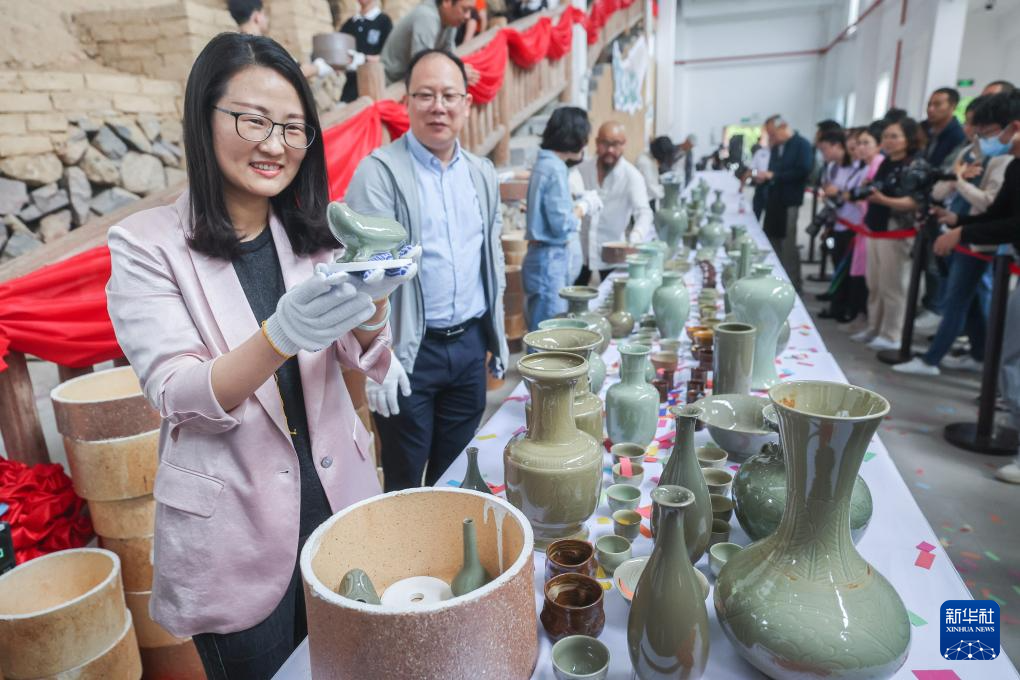 6月6日在慈溪市上林湖青瓷传承园举行的开窑仪式上拍摄的经过传统柴烧龙窑烧制的越窑青瓷作品。